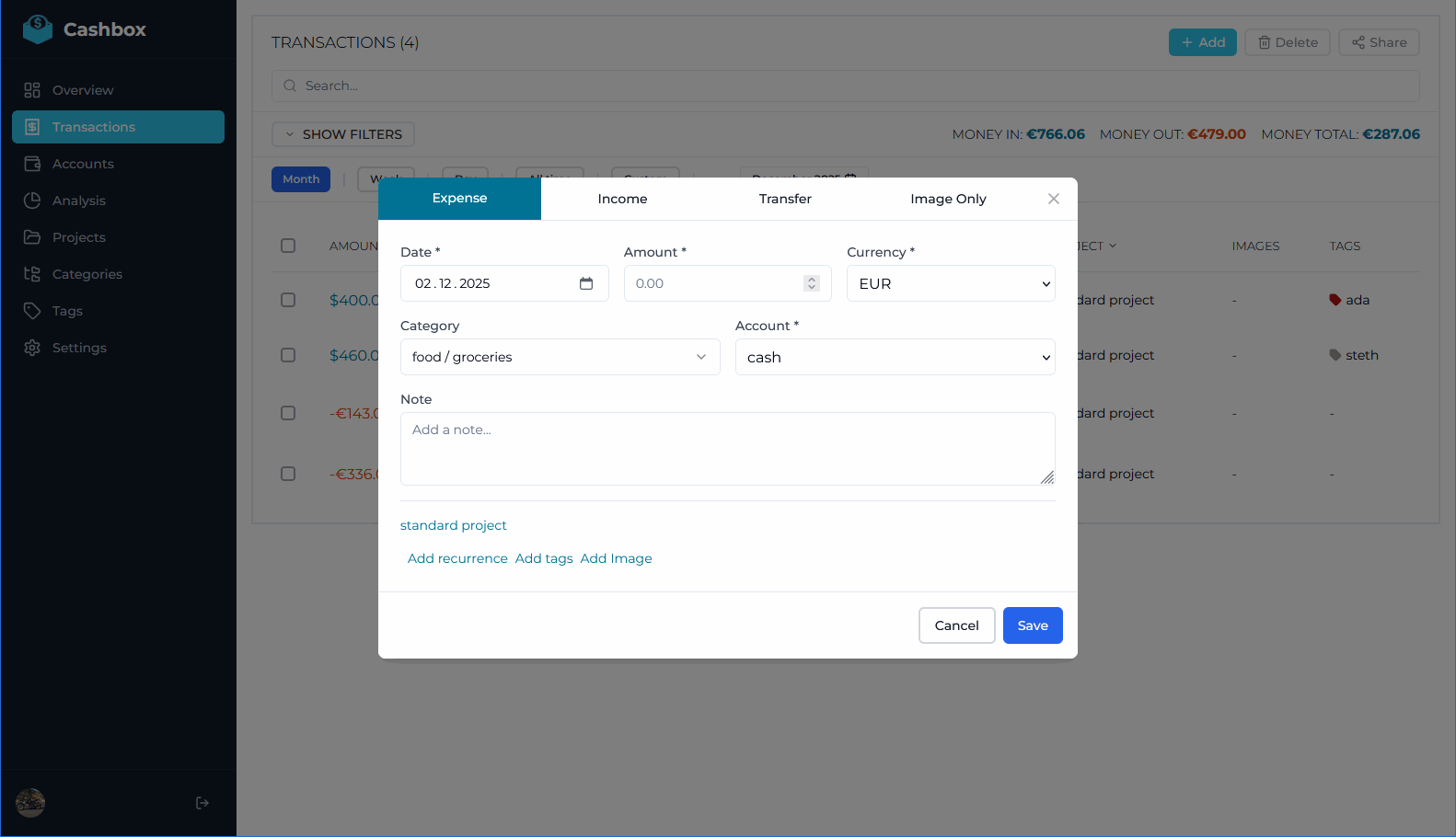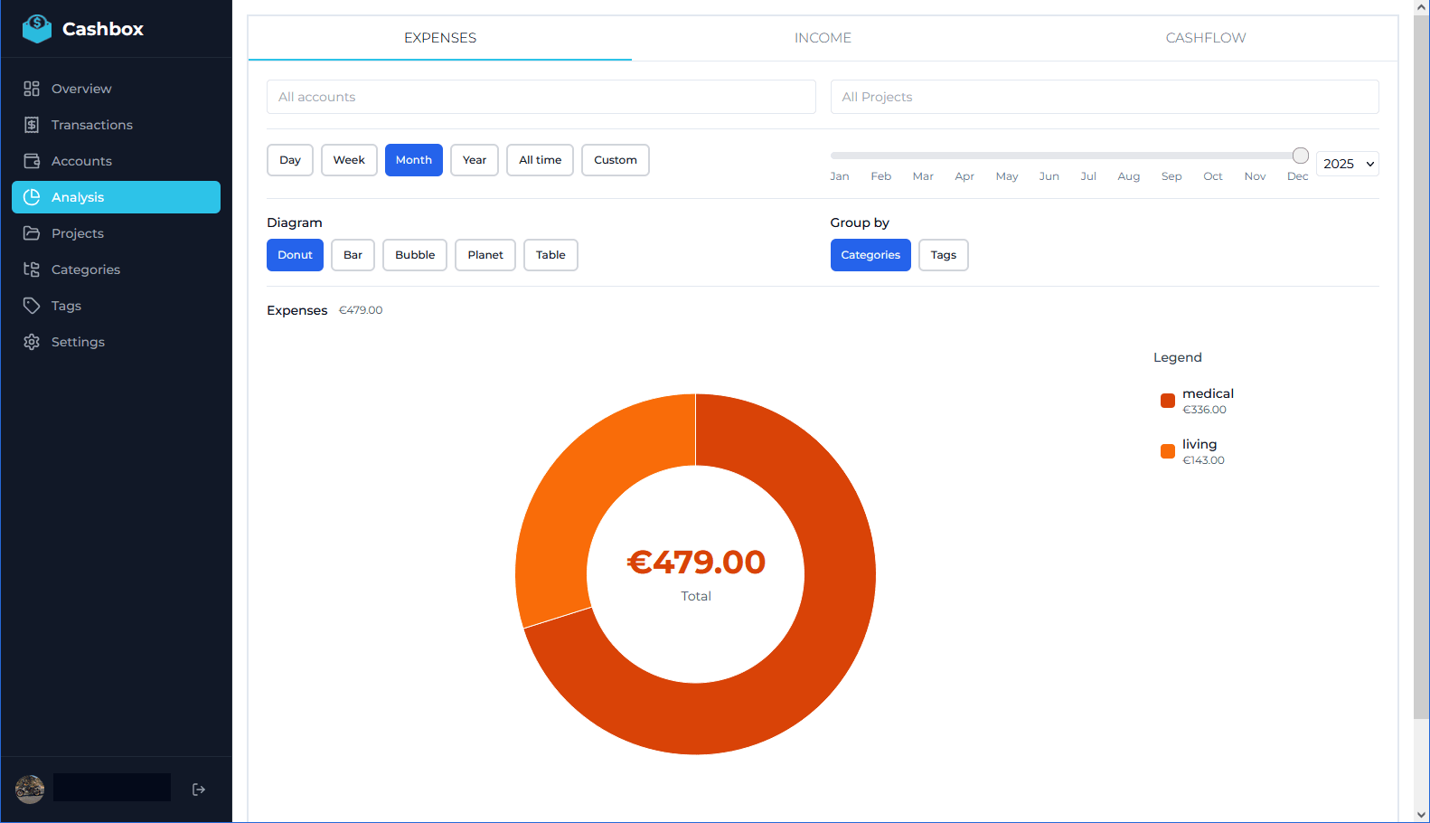 In cashbox you enter all your expenses and income to keep track of them. At the end of the month you see exactly how much money you spent and on what.